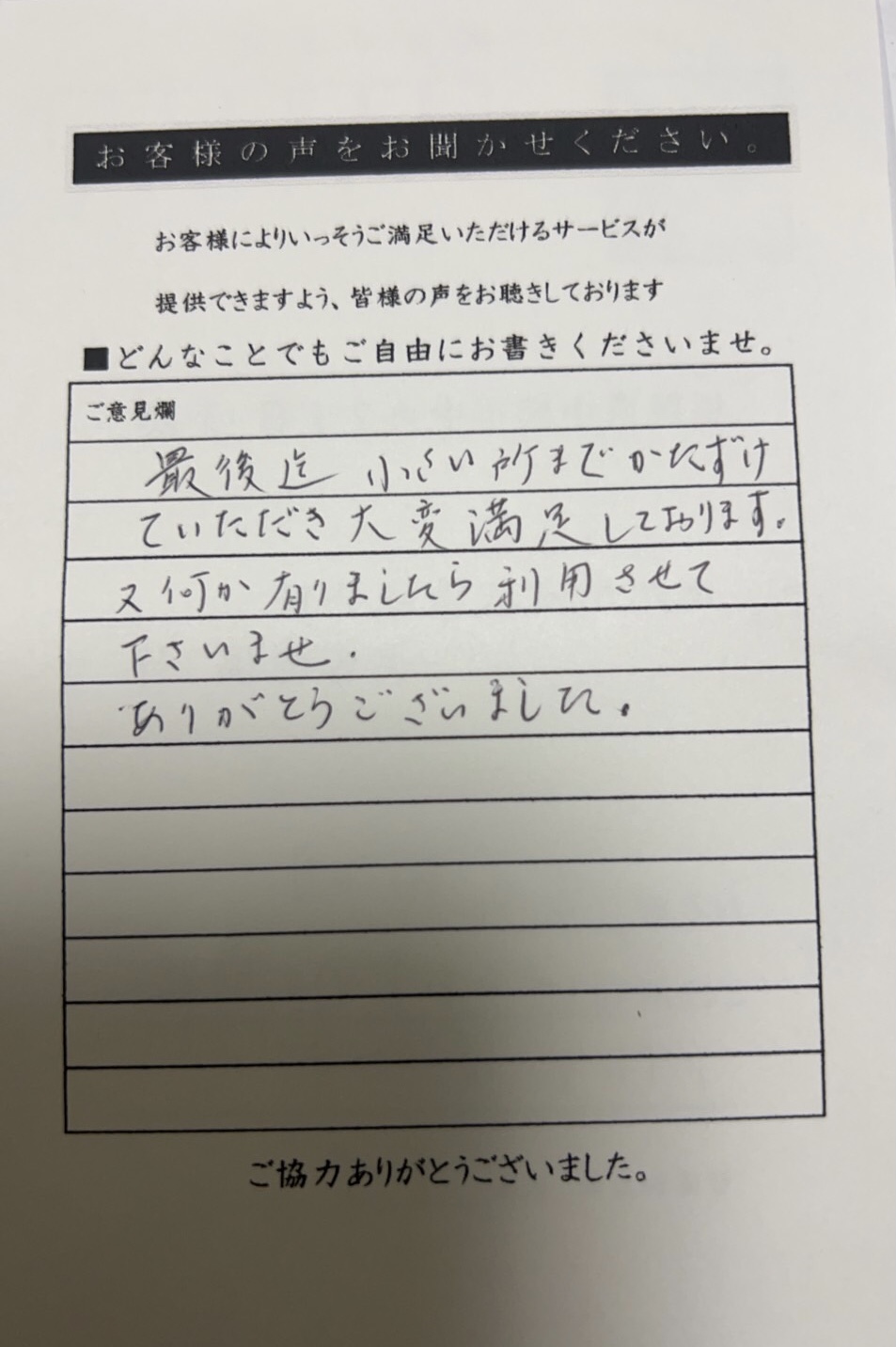 お客様の声をいただきました 先日、ご依頼がありましたお客様からおハガキをいただきました。 【お客様の声】 最後迄小さいところまでかたずけていただき 大変満足度しております。 又、何かありましたら利用させて下さいませ。 ありがとうございました。 Tweet